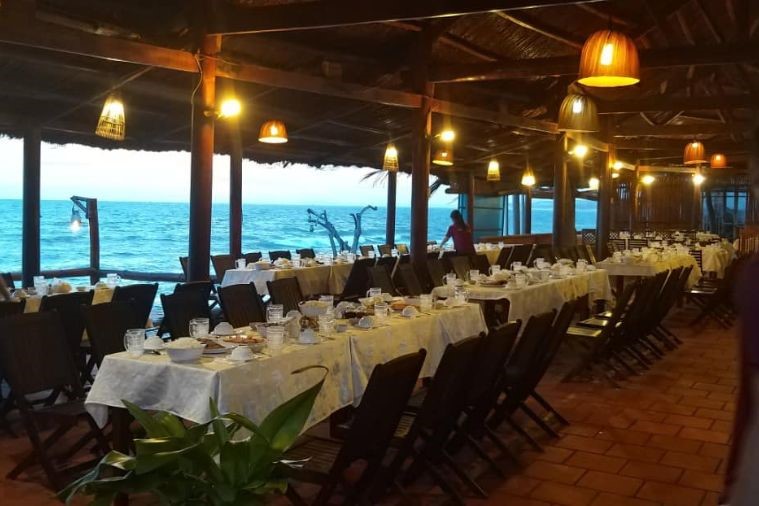Không gian nhà hàng Giọt Sương rất đẹp nên bạn có thể dùng bữa trưa với đối tác, hay đoàn khách, gia đình hay nhóm bạn đều được nhé! Thực đơn của nhà hàng rất đa dạng từ các món đặc sản Phan Thiết như: gỏi cá mai, dong nướng, lẩu cá bớp, mực một nắng đến các món Âu Á, hải sản truyền thống khác nữa.