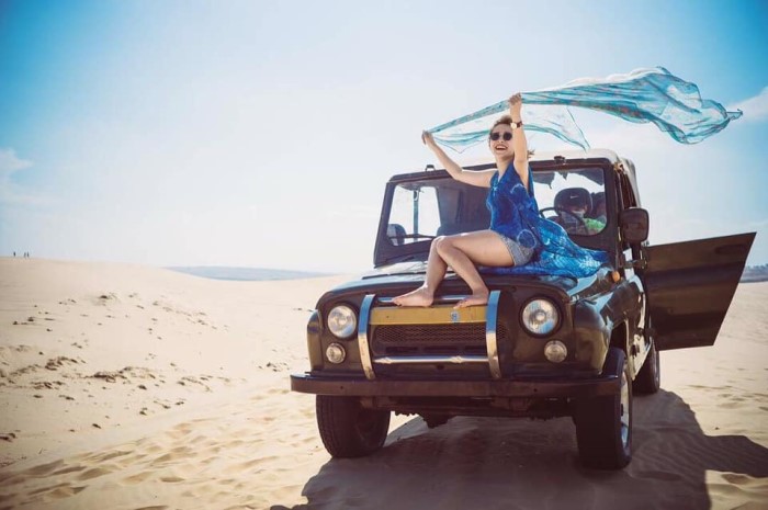 Đi Tour Mũi Né được lái ATV 4 bánh trên địa hình đồi cát hoặc ngồi xe Jeep chạy lên đỉnh là hoạt động vui chơi được nhiều bạn trẻ yêu thích. Một điểm cộng nữa của việc thuê xe địa hình tại Bàu Trắng là du khách có thể ghé đến chỗ cưỡi Lạc Đà chụp ảnh.