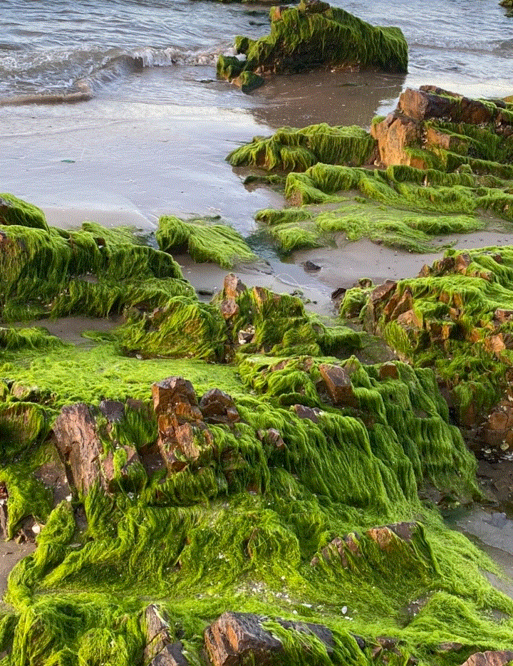 Thời gian giữa khuya nước thủy triều nơi đây sẽ rút xuống (nước rồng) và cũng là lúc bình minh ló dạng thì các bãi đá được nhô lên và rêu xanh phủ đầy các phiến đá tạo ra một khung cảnh thiên nhiên tuyệt đẹp.