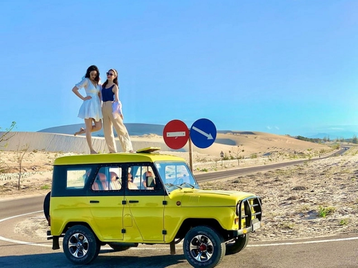 Các bạn trẻ thuê xe jeep đi tour đồi cát bàu trắng thường đi ra Cung đường đôi Bàu Trắng này hay còn gọi Cung đường vòng cung Mũi Né để chụp ảnh bên chiếc xe jeep đẹp lung linh và độc đáo của Bình Thuận. Từ đường vòng cung nếu thuê xe jeep đi tiếp một đoạn nữa không xa theo cung đường cát trắng ra xe nước vàng, bạn sẽ được chụp ảnh bên xe nước Journey tại một cung đường ven biển đẹp nhất Mũi Né. Xe jeep Mũi Né và xe nước màu vàng cam là một trong hai chiếc xe tạo nền cho những góc chụp tuyệt đẹp cho du khách trên cung đường biển tại khúc đường vòng cung.