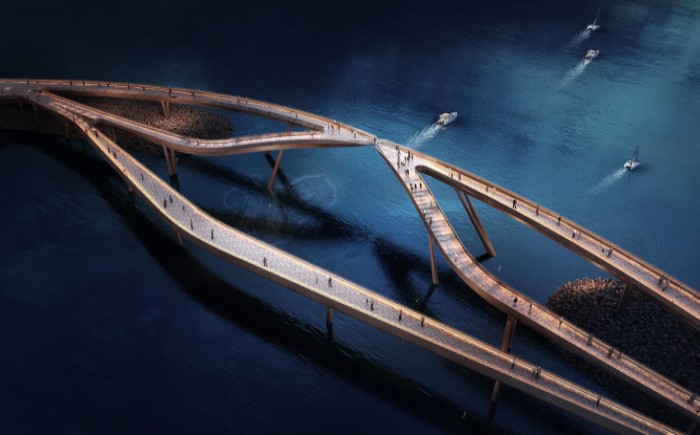Kiss Bridge bao gồm hai nhánh độc lập, mỗi nhánh dài 400m tựa như dải lụa mềm vươn mình ra giữa muôn trùng khơi. Thế nhưng, điểm đặc biệt nhất là hai nhánh lại "gặp" nhau ở lưng chừng trời và… cách nhau 50cm. Khoảng cách vừa đủ cho hai người chạm được vào nhau, trao nhau nụ hôn nhưng không vượt qua ranh giới.