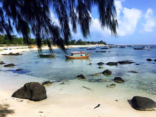 There are many beautiful places to visit in the island, such as Trieu Duong bay, Doi Dua beach, Nho beach – Hang spit, Tranh islet... Among them, Trieu Duong bay, with the beach of white smooth sand and clear blue sea water next to casuarina trees, is the perfect place for swimming and picnic. On moonlit nights, local people often gather at the beach, enjoying relaxing moment chatting, singing, dancing together.