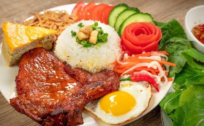 Com Tam, also known as broken rice, is a popular Vietnamese dish, made with broken rice, grilled pork chops, a fried egg, and pickled vegetables. It's a filling and delicious meal, and it's often eaten for lunch or dinner.