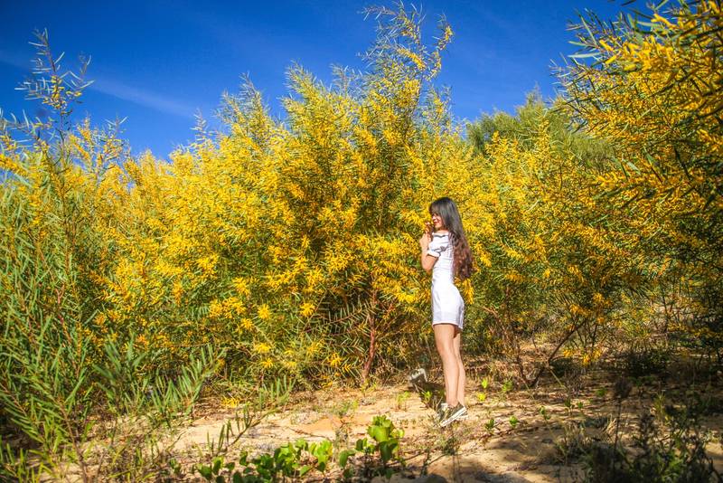 Trên con đường cát trắng này, một địa điểm check in đang được các bạn trẻ chia sẻ rất nhiều đó chiếc xe bán nước màu vàng cam, một bên là rừng keo lá tràm nở hoa vàng chói chang vào tháng 3-4 và tháng 12-1 dương lịch.